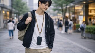 ここで、私は「2WAY仕様」へのカスタマイズを特におすすめしています。首掛け用の長いメイン紐と、手首用の短いサブ紐を小型のカラビナで連結しておけば、食事中やホテル内では短く、移動中は長く、といった使い分けが瞬時に可能です。